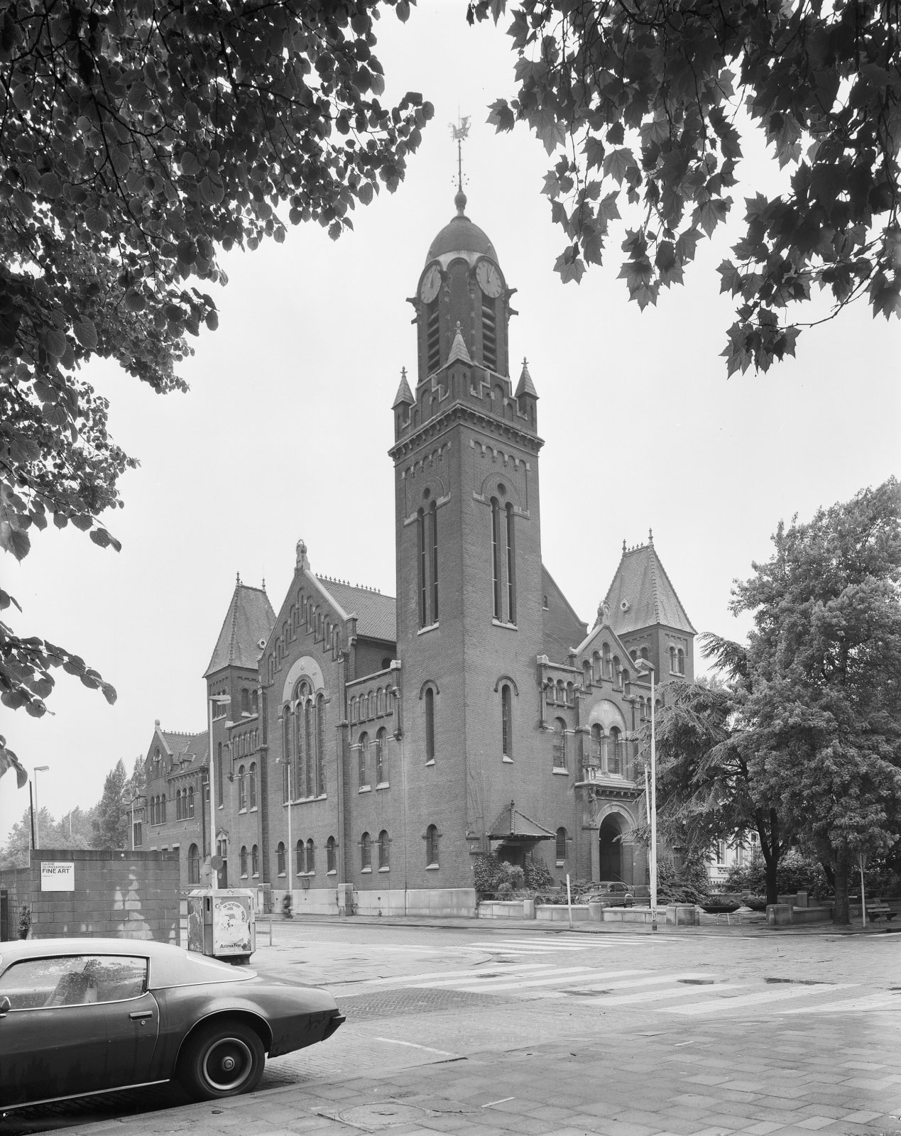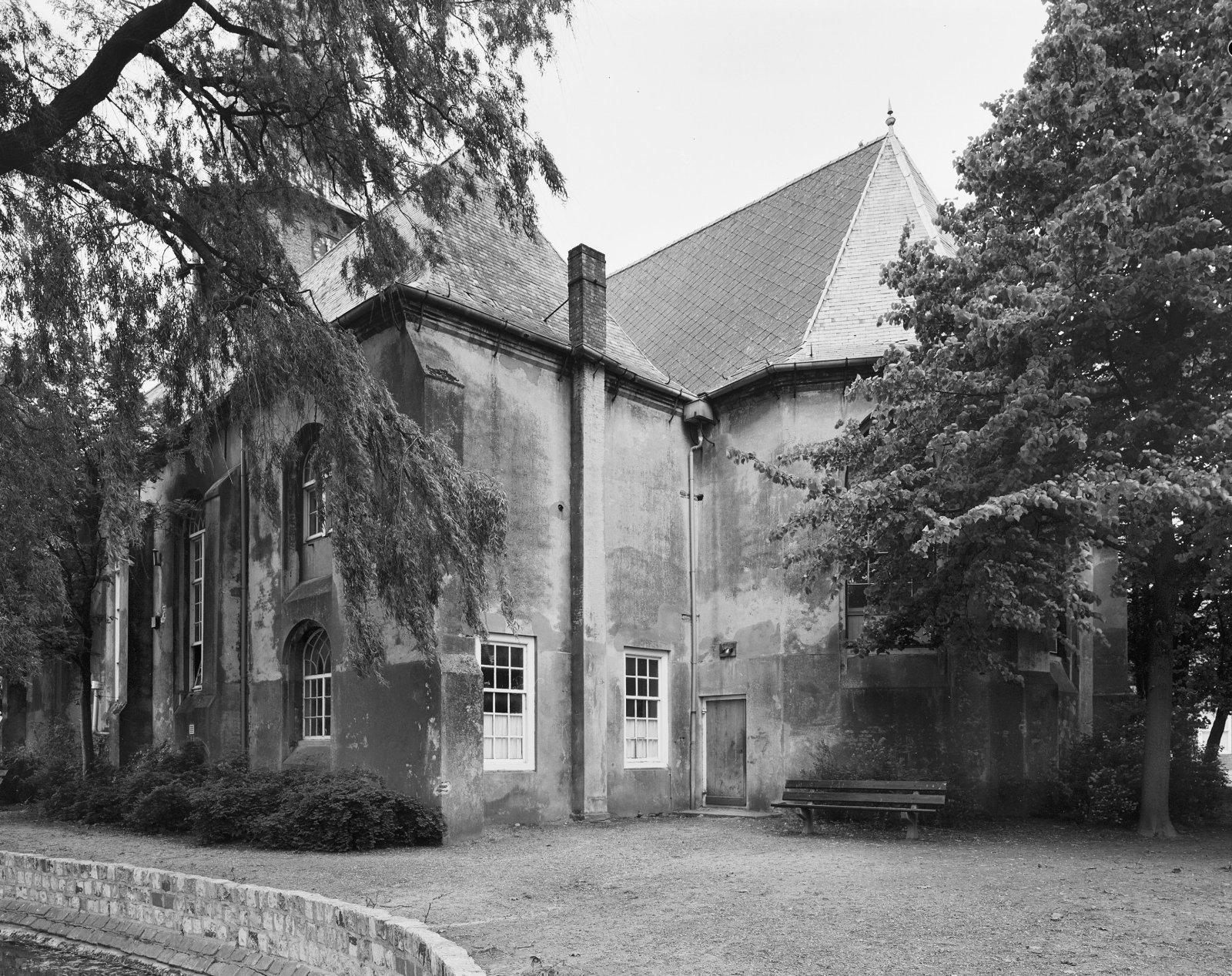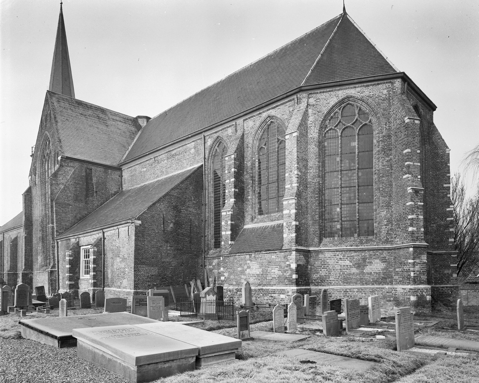 Zuid-oostzijde kerkgebouw, bomen op de voorgrond