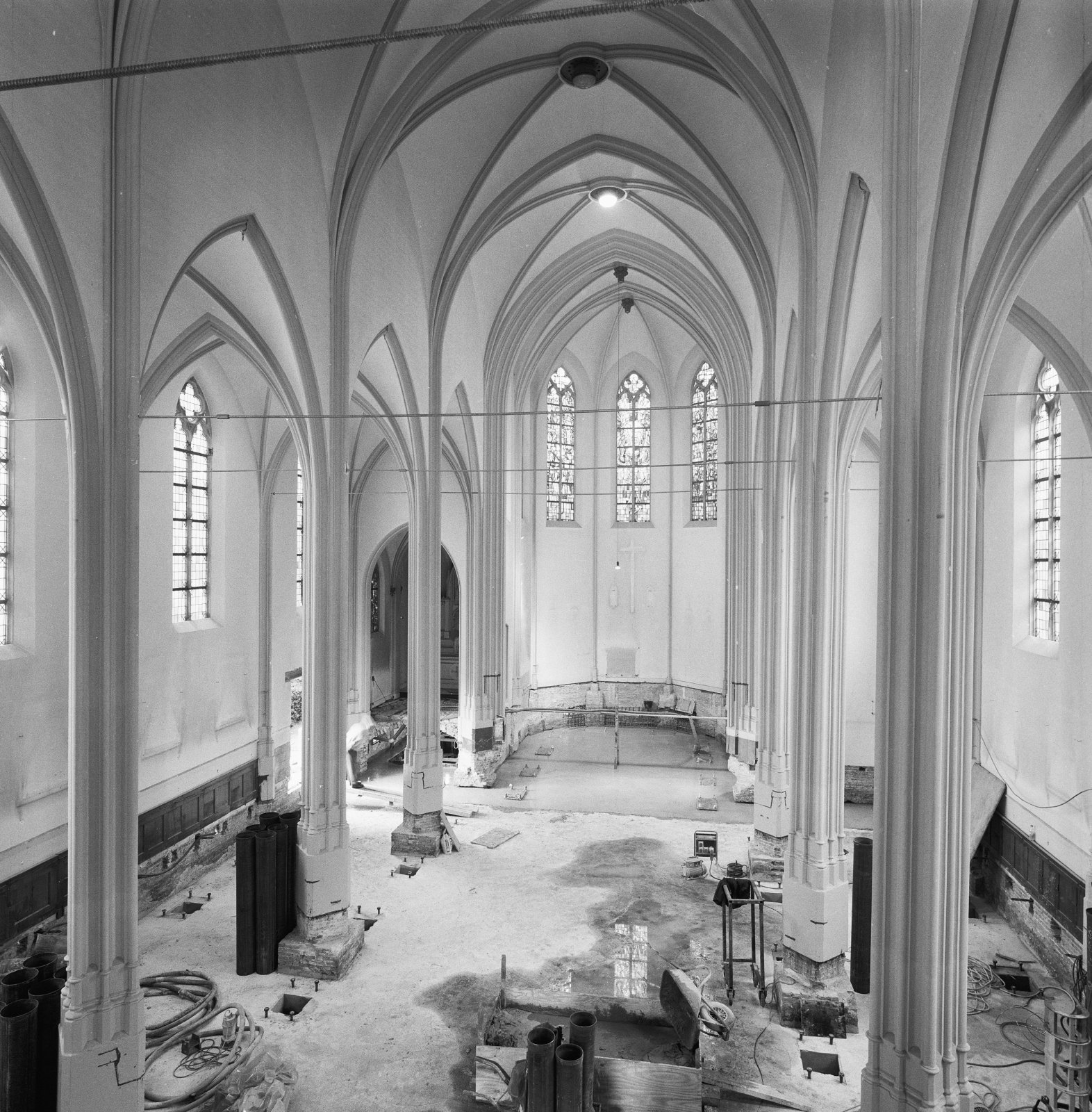 Interieur, overzicht naar het koor tijdens restaurat...