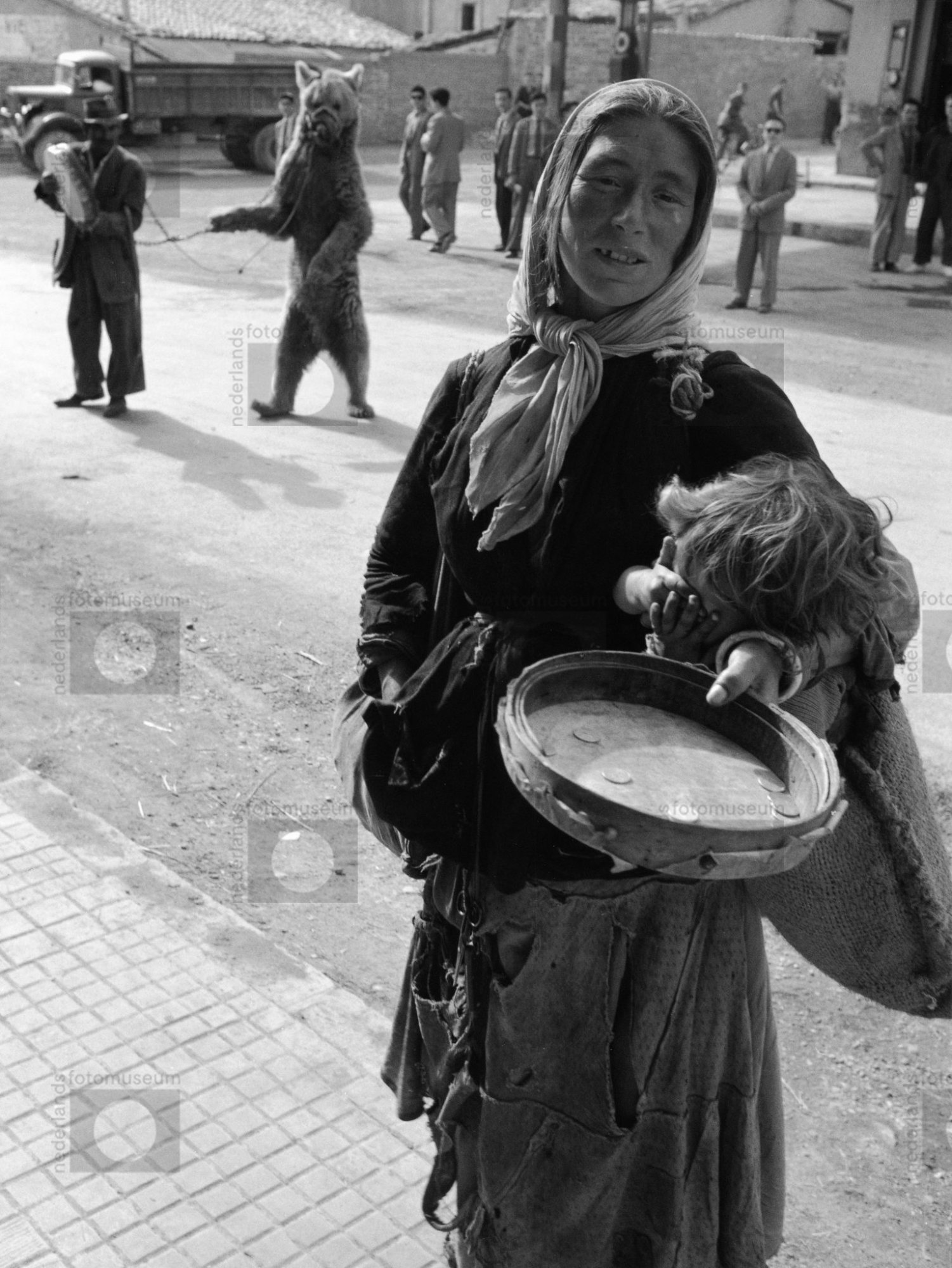 Zigeunervrouw en man met tamme beer op de achtergron...