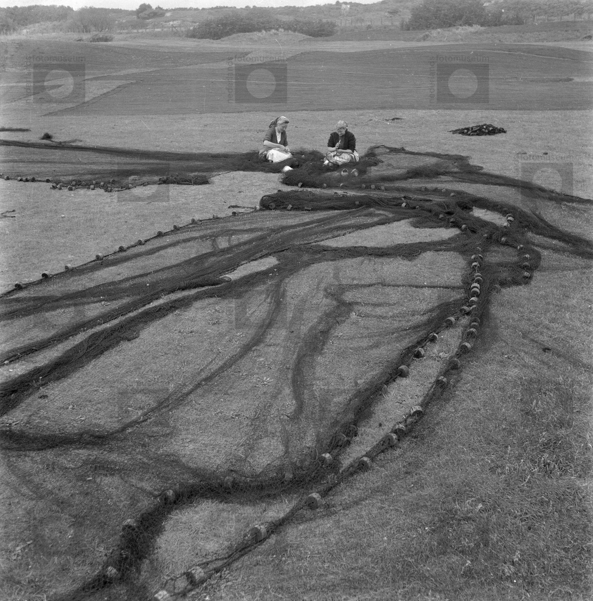Vissersvrouwen repareren visnetten (1950-1959)