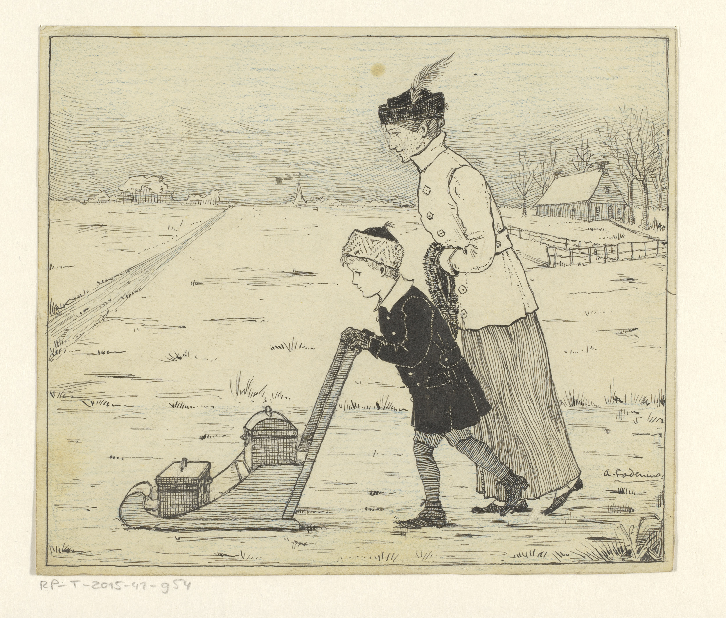Jongen en vrouw met slee op het ijs