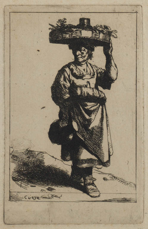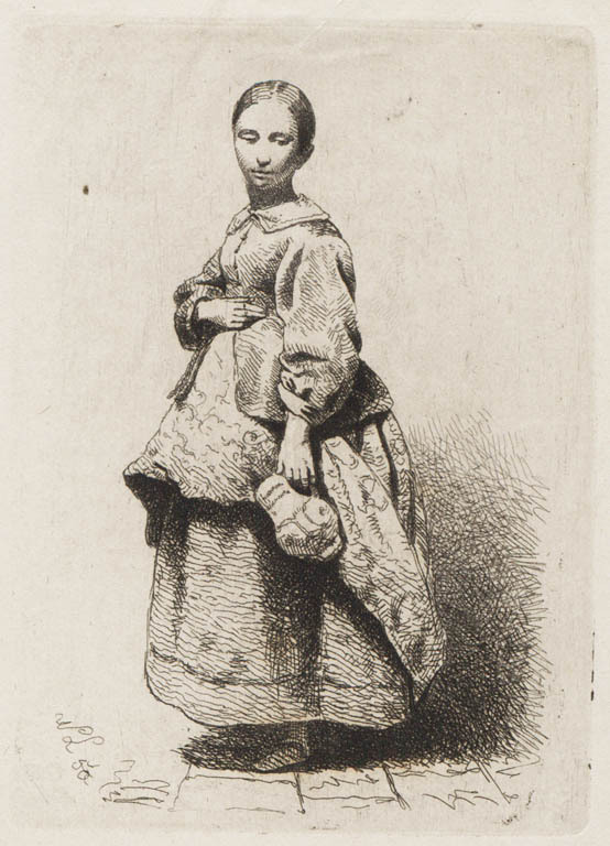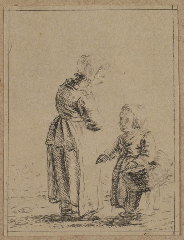 Staande vrouw en een meisje met een mand.