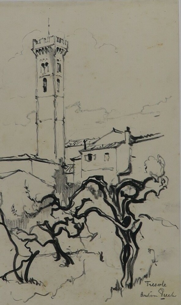 Toren met olijfbomen te Fiesole, reistekening Italië