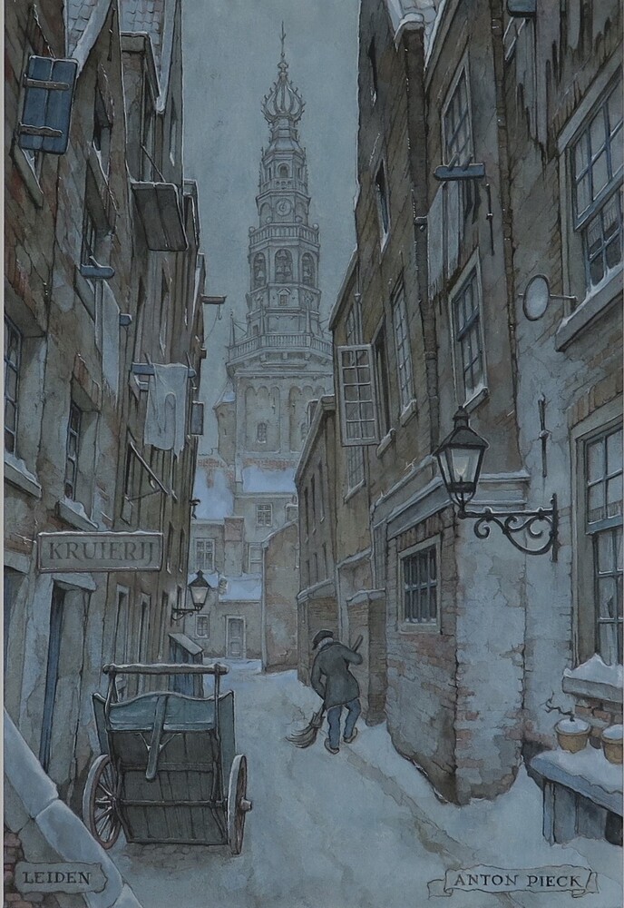 Man die sneeuw veegt, kalenderplaat Leiden, Dwars Ko...