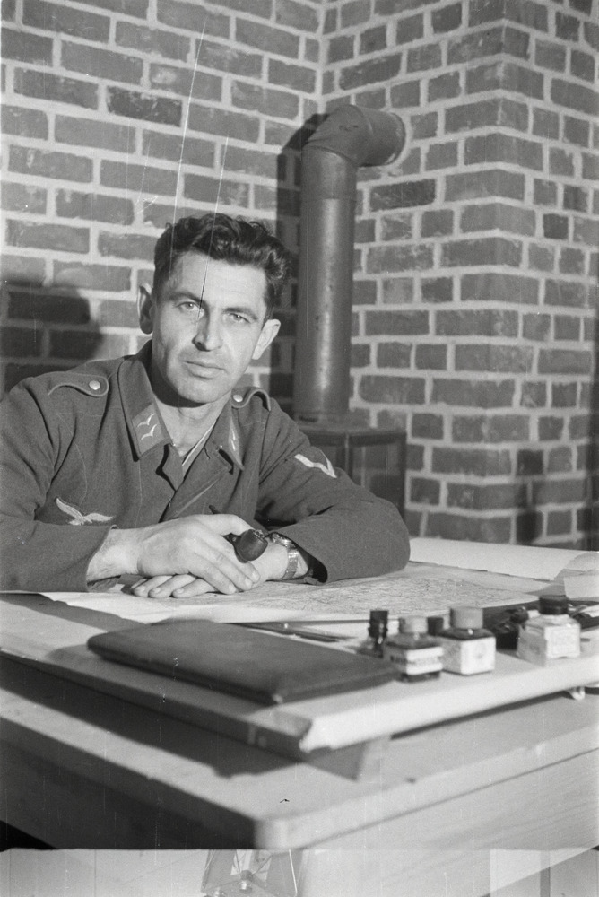 Een Luftwaffe Gefreiter achter zijn bureau.