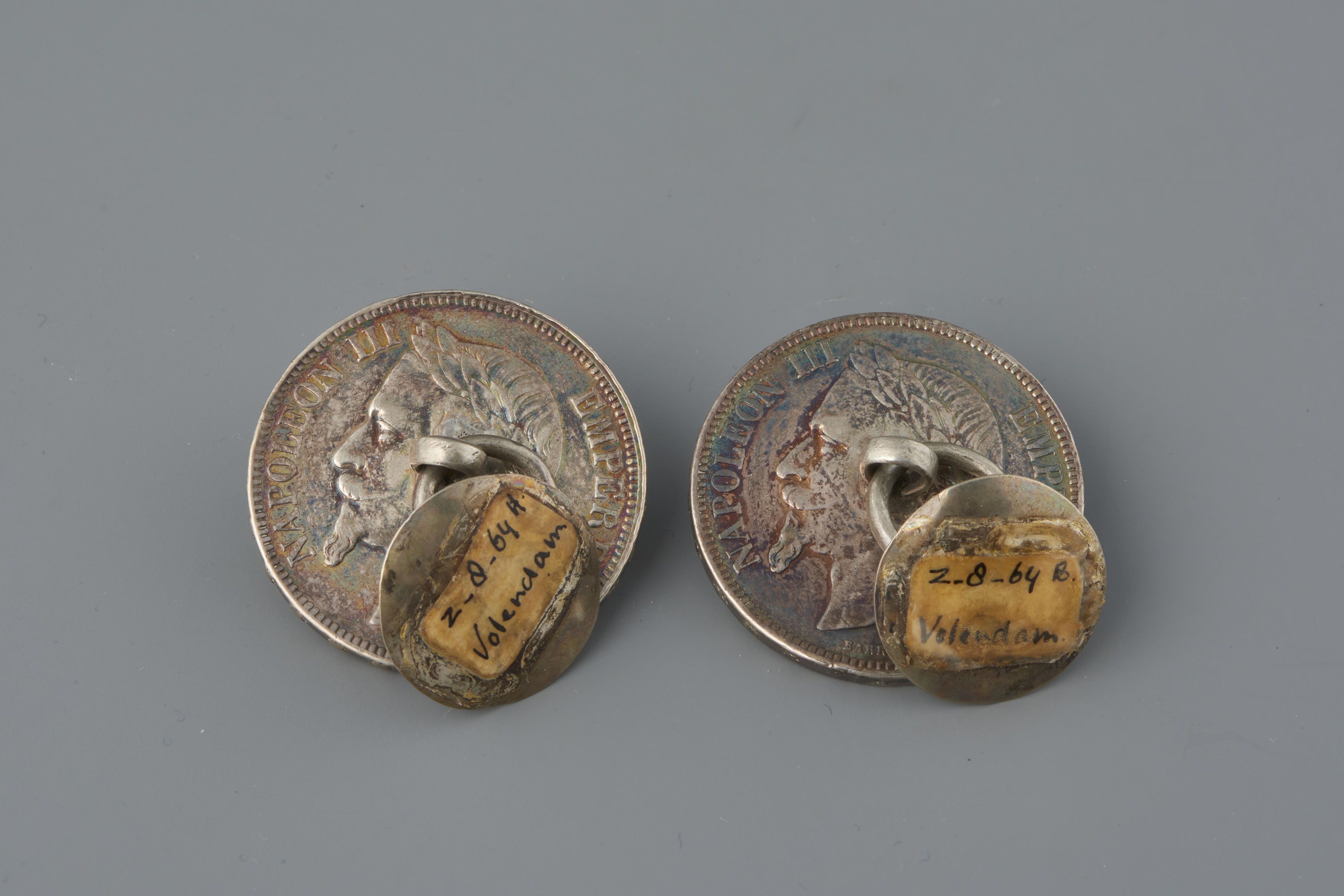 Paar broeksknopen van zilveren munten, Volendam