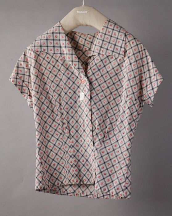 Getailleerde blouse, wit met grijze ruit en roze roo...