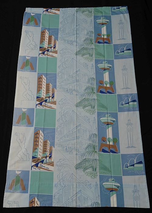 Blauw gordijn met afbeeldingen van de stad Rotterdam