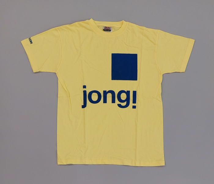 T-shirt van geel tricotkatoen met blauwe opdruk van ...