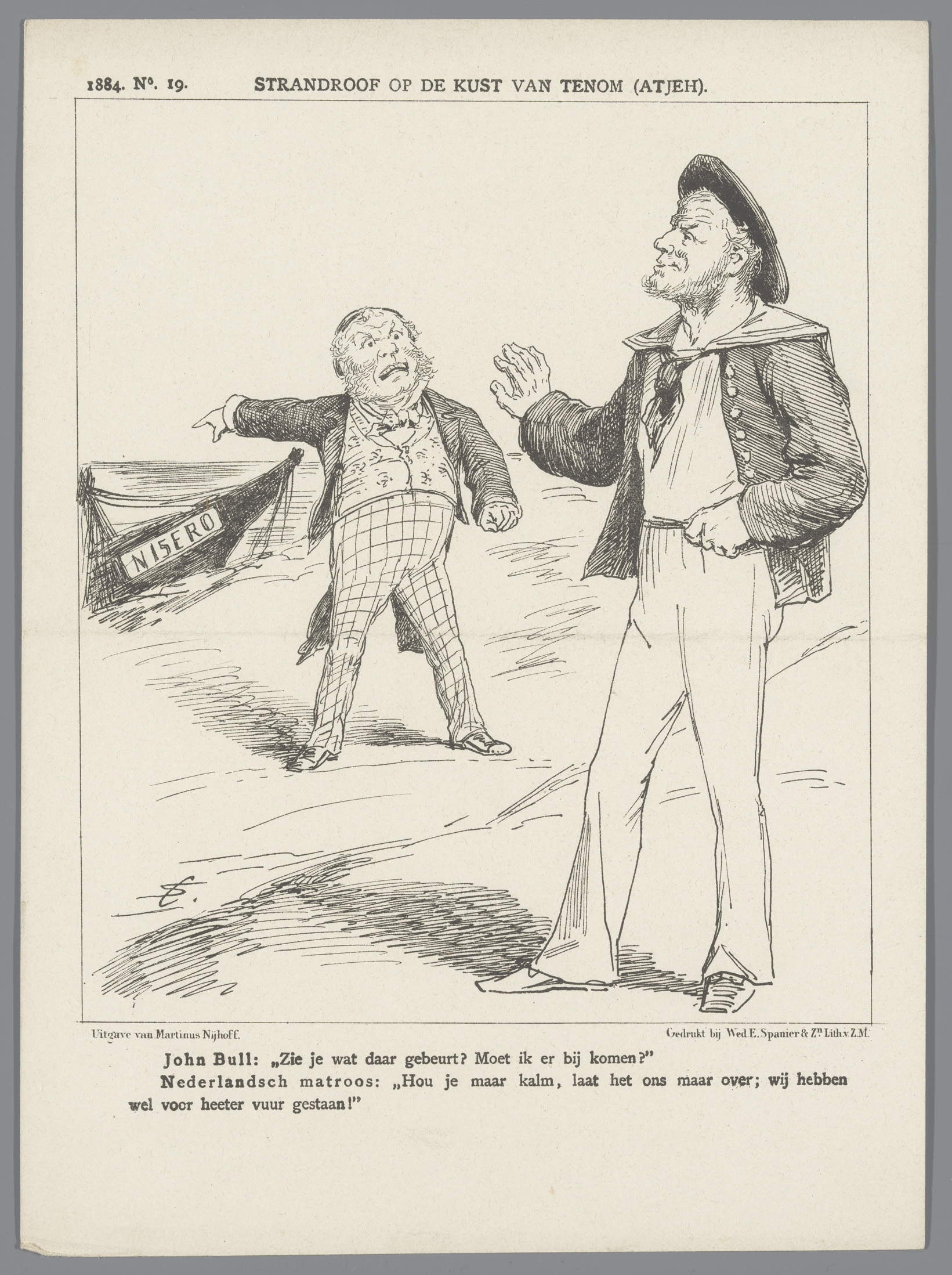 Spotprent over het stranden van de Nisero, 1884
