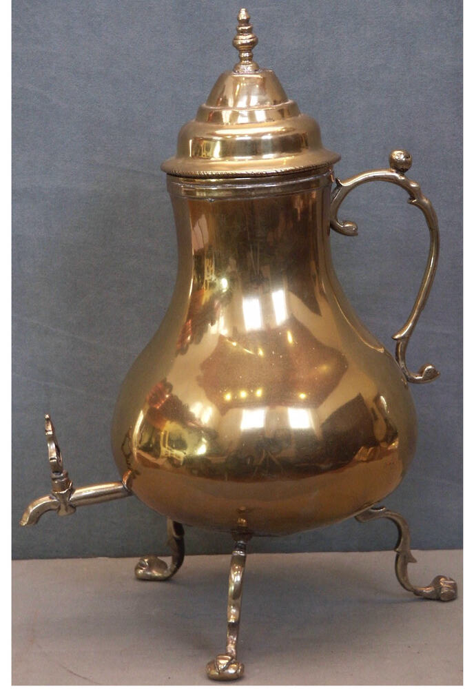 Koffiekan van geel koper op drie poten met kraan.
