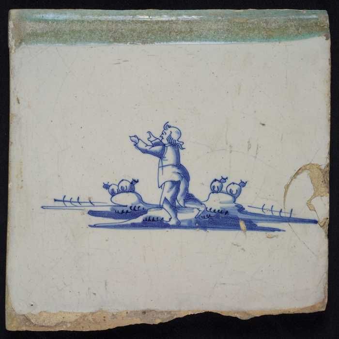 Figuurtegel, blauw, herder met schapen, geen hoekmotief