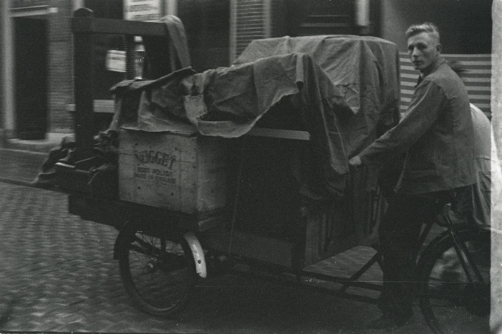Een man op een bakfiets gevuld met goederen.