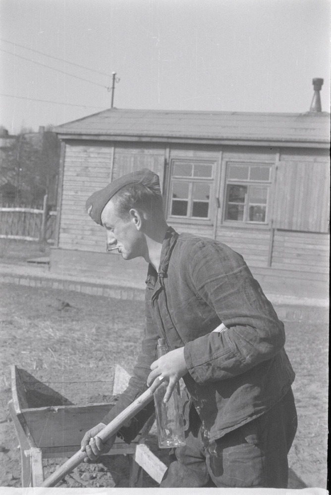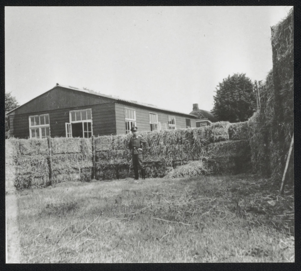 Duitse militair voor barakken beschermt door strobal...