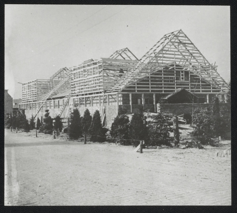 Bouw van een stenen muur en een dakconstructie om/ov...