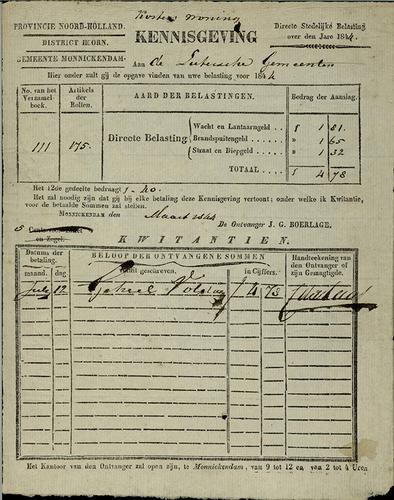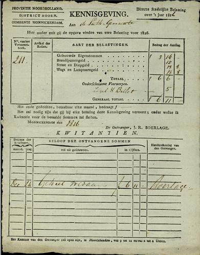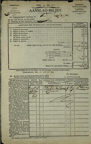 Aanslagbiljet personele belasting Monnickendam, 1826