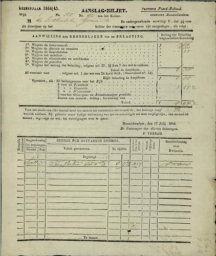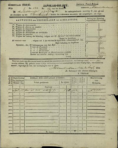 Aanslagbiljet personele belasting, 1844