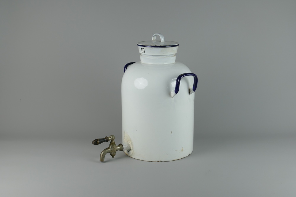 chocoladeketel van geëmailleerd ijzer met koperen kr...
