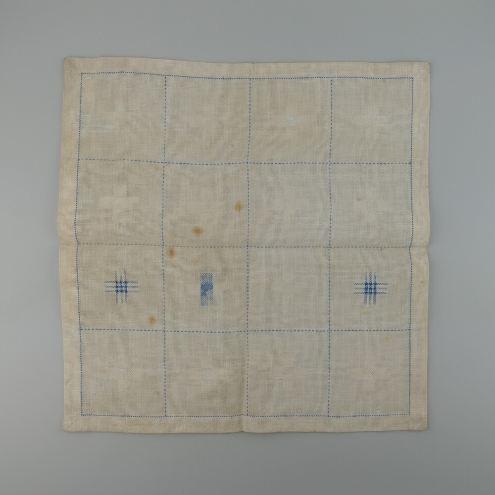 proeflap van stoplap met blauw en wit garen in 16 va...