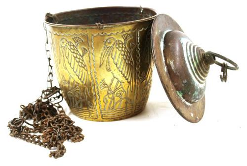 Pot of hangpot van koper met kettingen om op te hangen