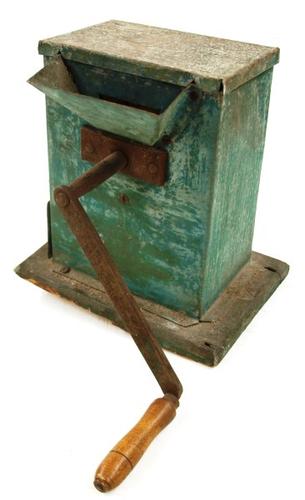 Graanmolen van metaal en houten plank gebruikt om ha...