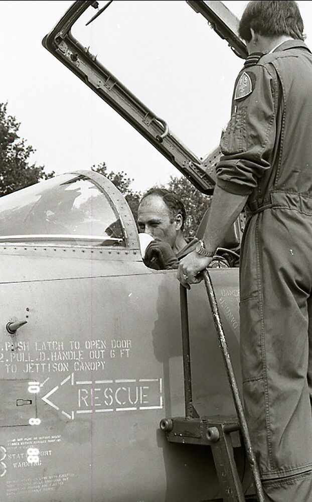 Personen krijgen een uitleg door een piloot van de USAF