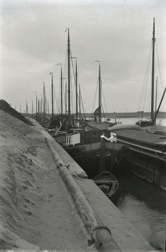 Binnenvaartschepen liggen aan de kade.