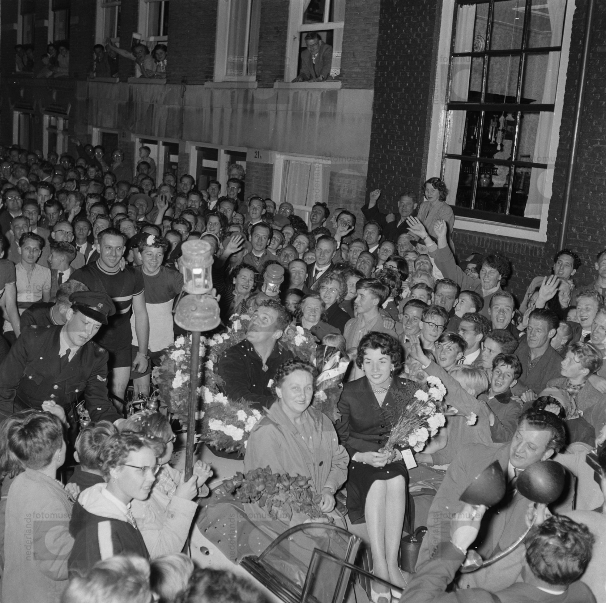 Huldiging wielerkampioen in open auto. Voorin zijn m...