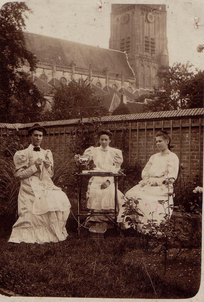 Zusters van Maaren in de tuin van de Aart Robberstraat.