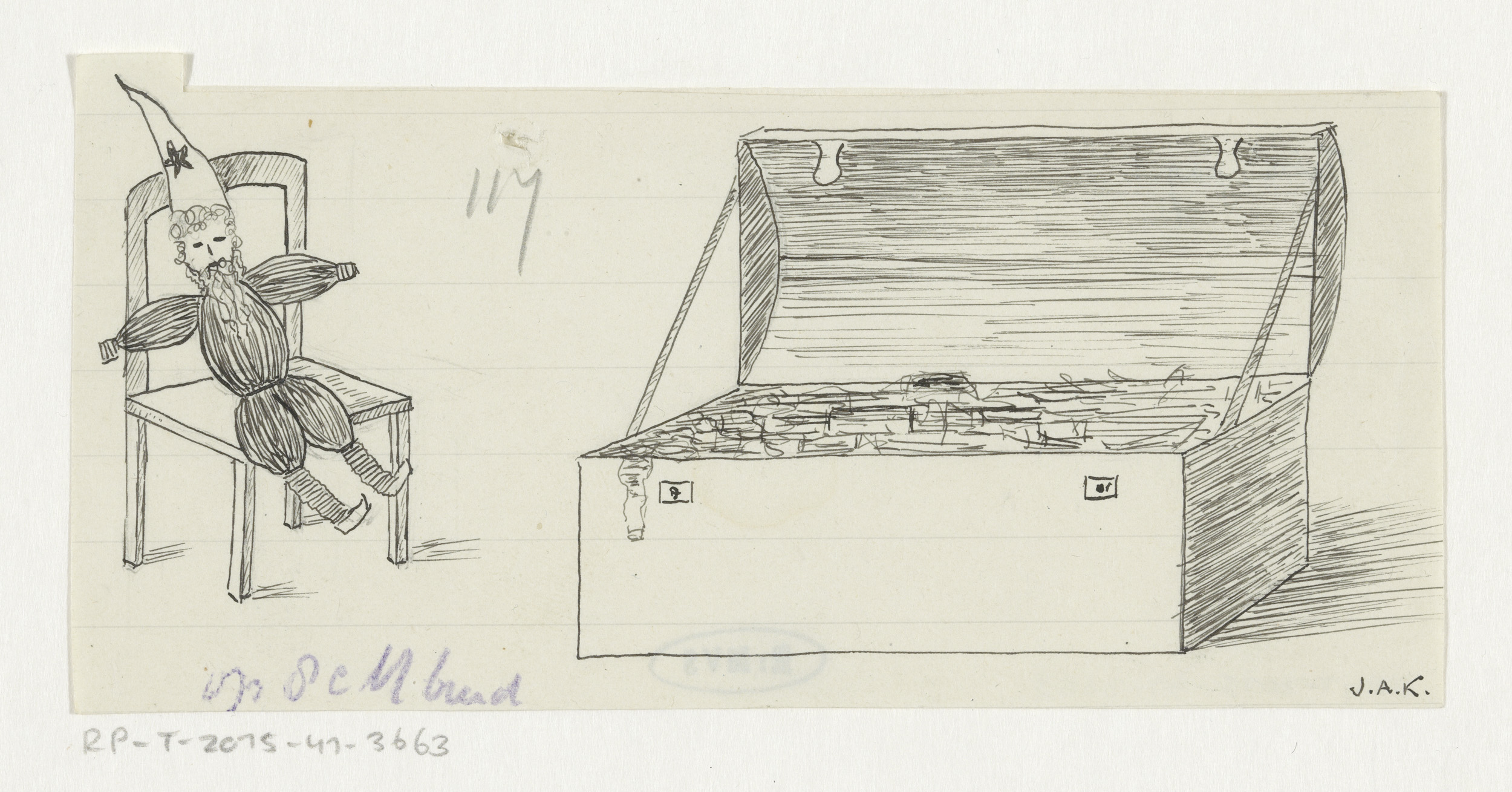 Pop op een stoel naast een kist