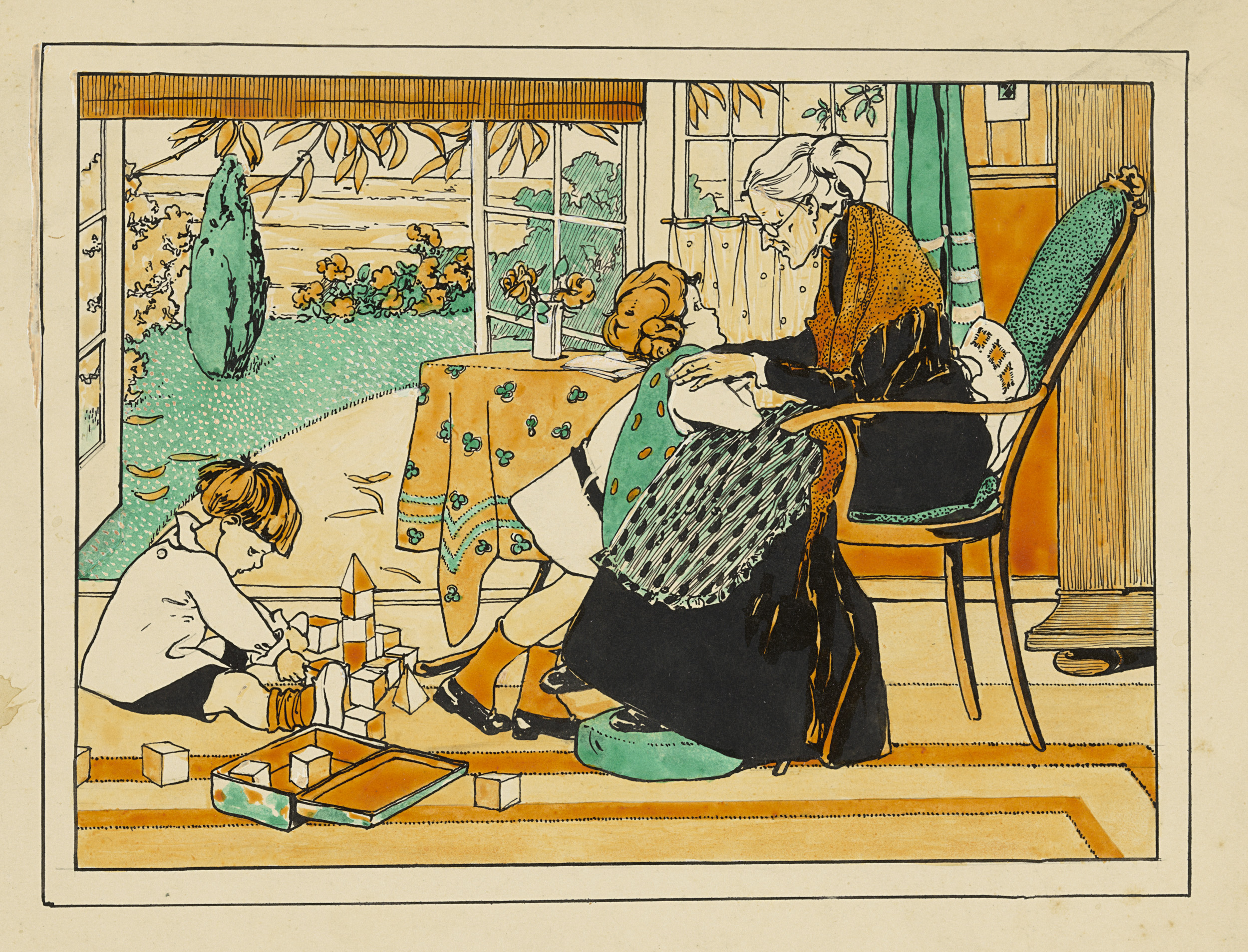 Twee kinderen en een oude vrouw in een interieur