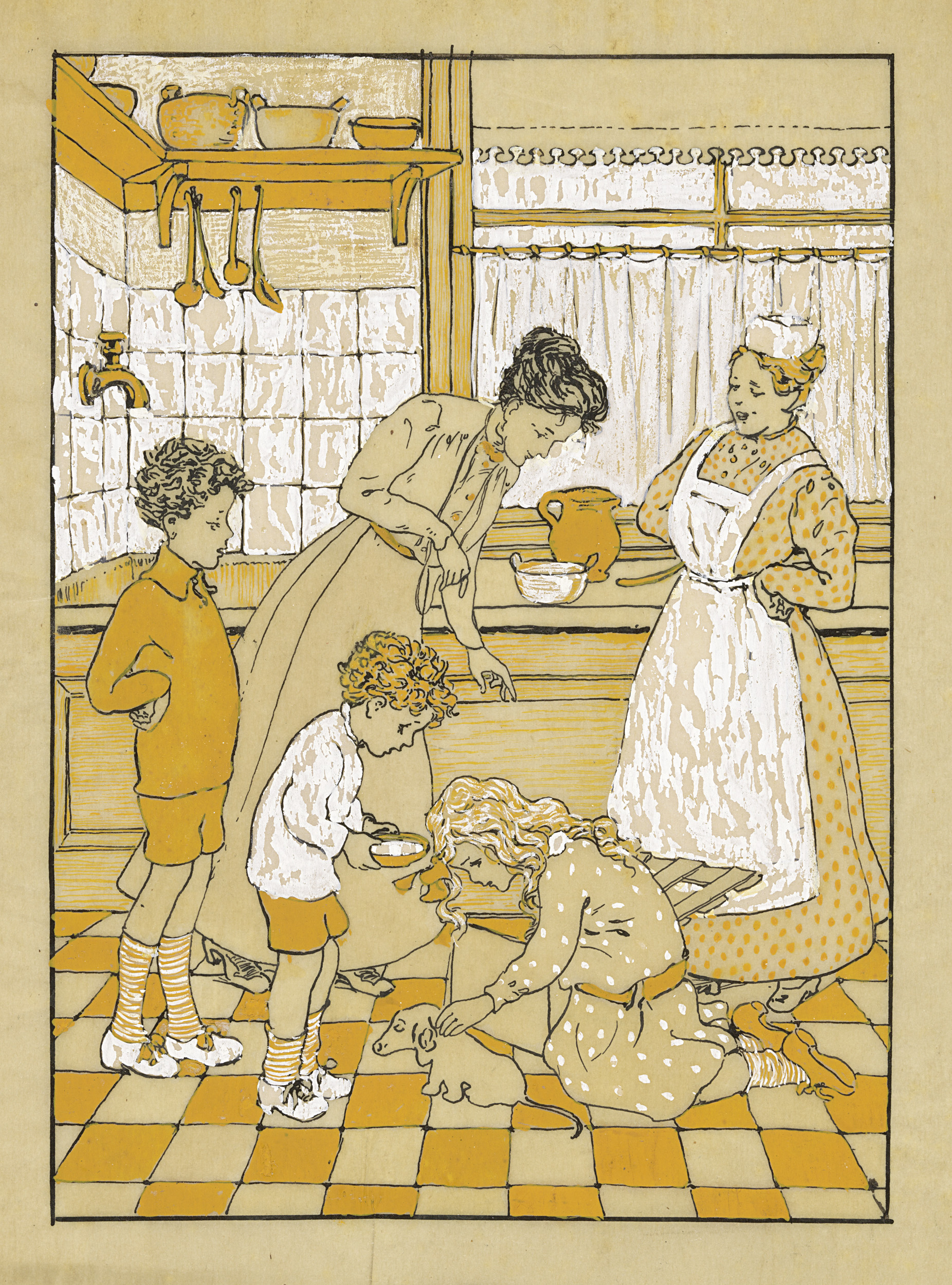 Vrouwen en kinderen met een puppy in een keuken