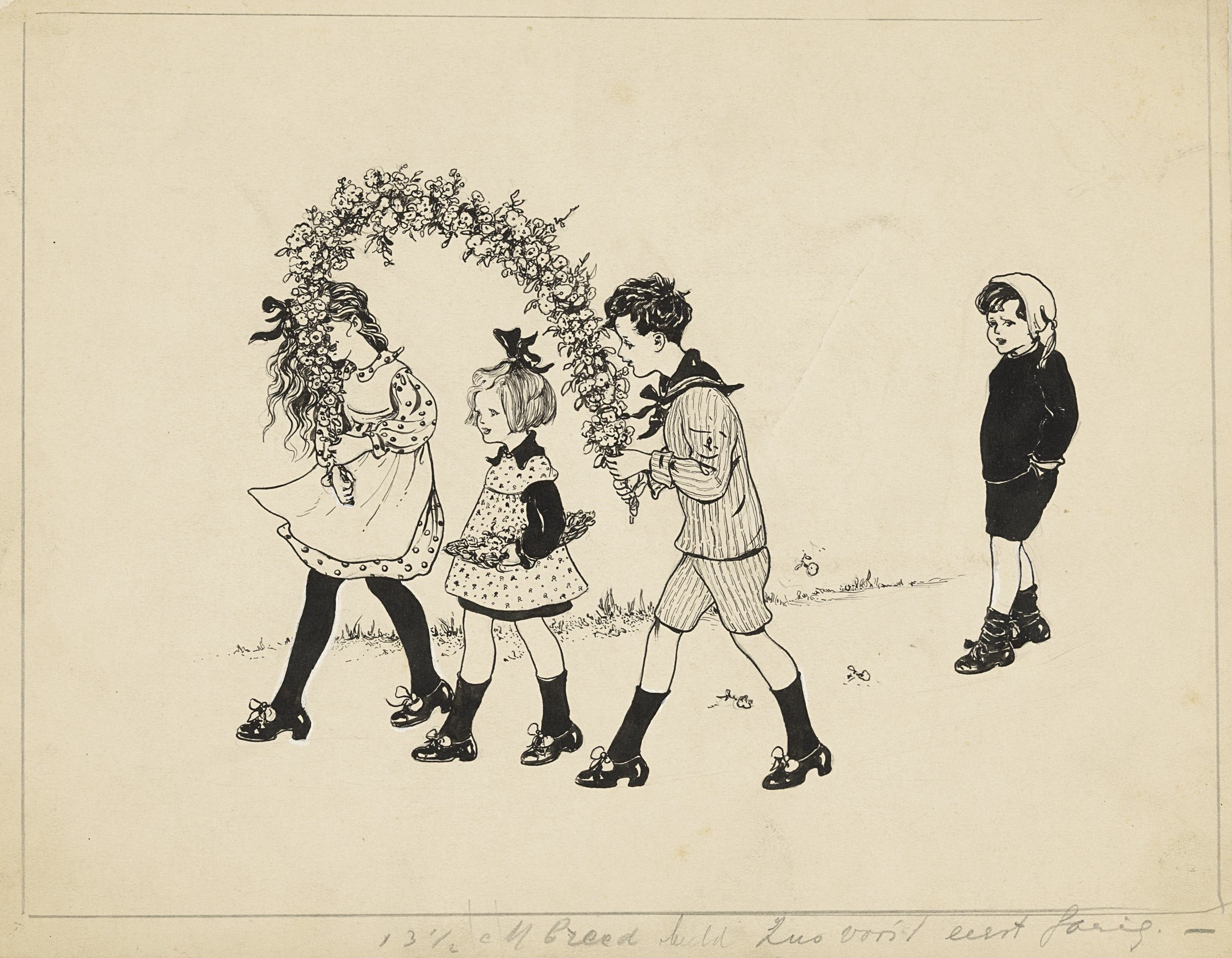 Em lopend onder een boog van bloemen