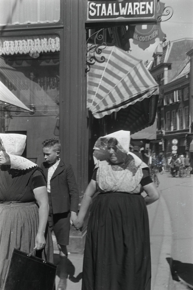 Nederlands straatbeeld met 2 vrouwen in klederdracht...
