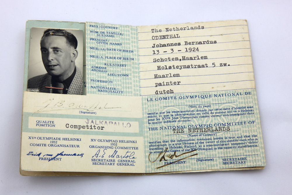 Identiteitskaart van Joop Odenthal van de Olympische...