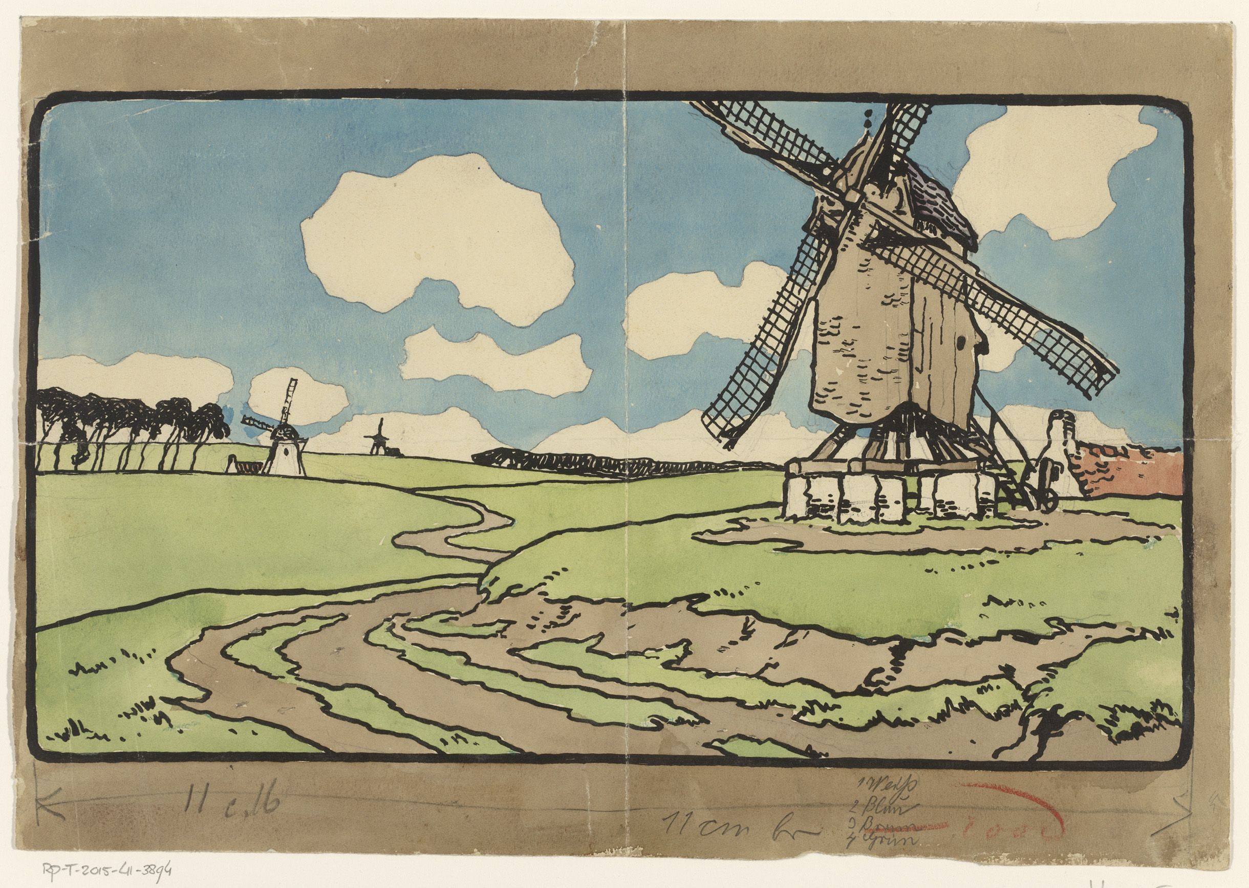Landschap met een molen langs een weg