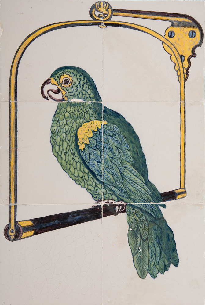 Tegeltableau, voorstellende een papegaai op stok, ve...