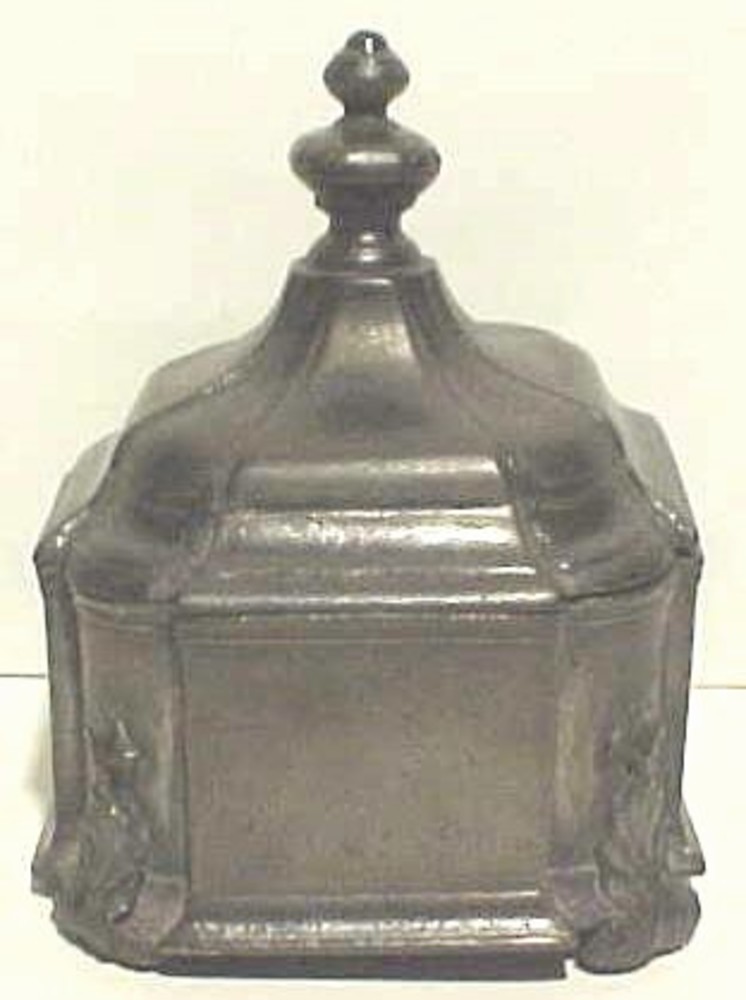 tabakspot. Vierkante tinnen bak met ronde naar binne...