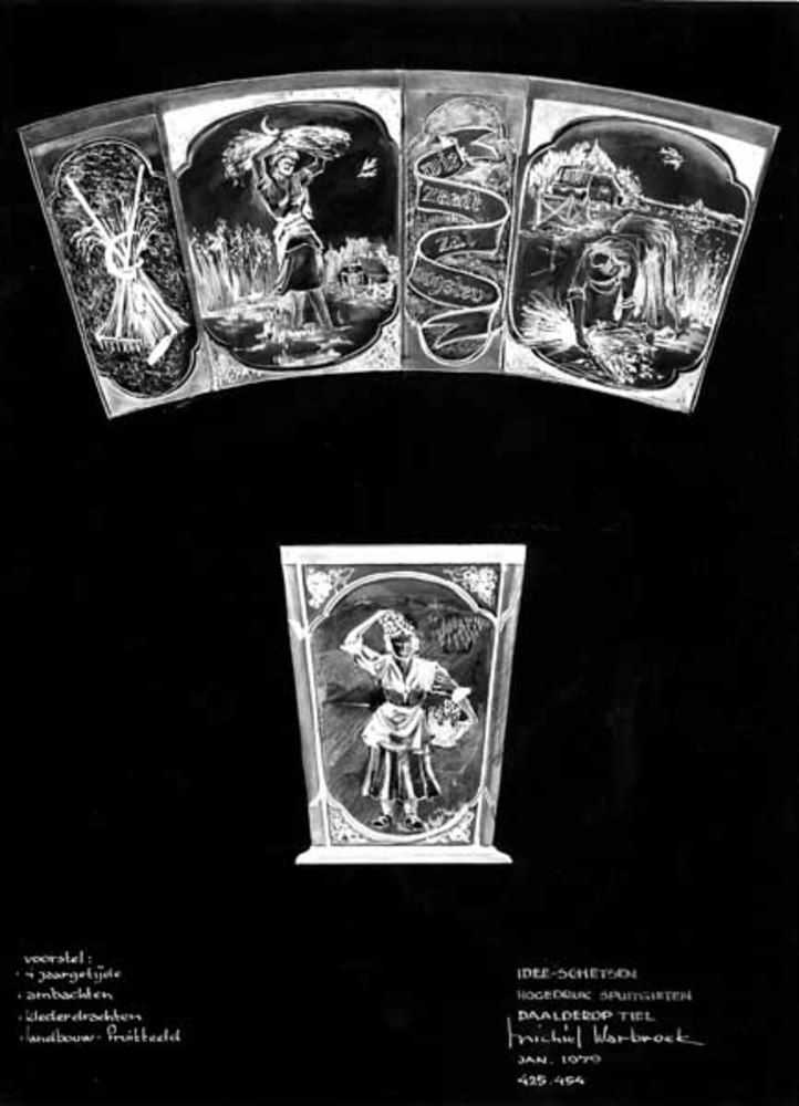 Ontwerptekening in aquarel van een gedecoreerde beke...