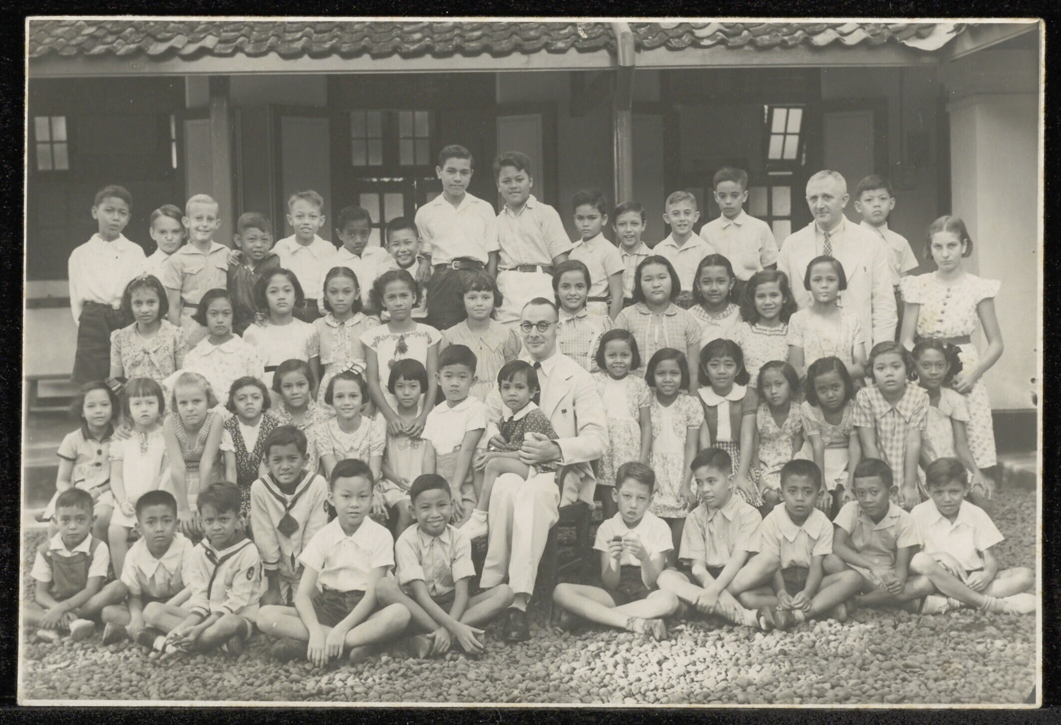 Portret van een gezelschap voor een schoolgebouw