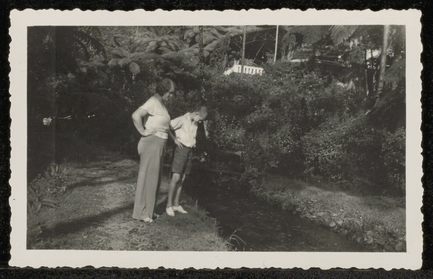 Vrouw en zoon kijken naar de visjes in de sloot