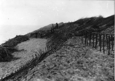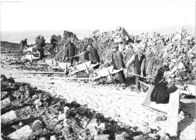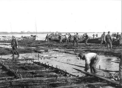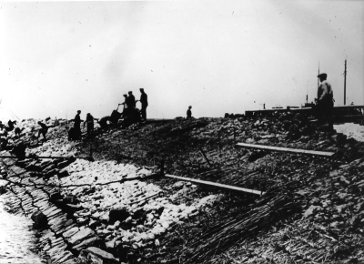 Arbeiders met scheppen en kruiwagens op de Afsluitdijk