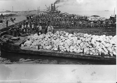 Arbeiders bezig met het verzwaren van een zinkstuk o...