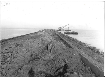Stuk dijklichaam van de Afsluitdijk. Drijvende kraan...