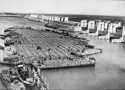 Bouw van een sluizencomplex van de Afsluitdijk.