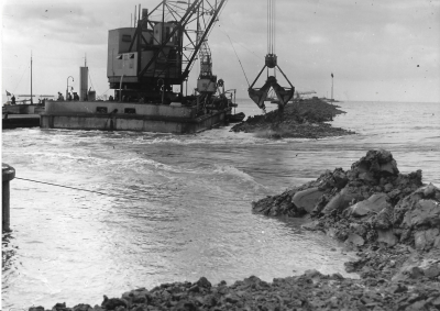 Drijvende kraan bezig bij een sluitgat van de Afslui...
