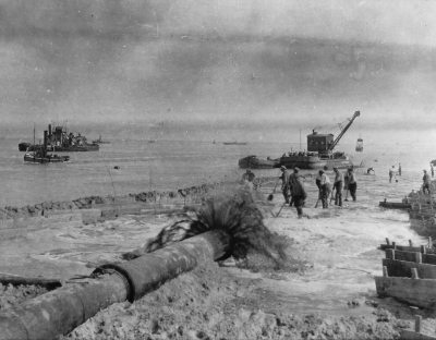Zand opspuiten tussen twee perskades van de Afsluitdijk