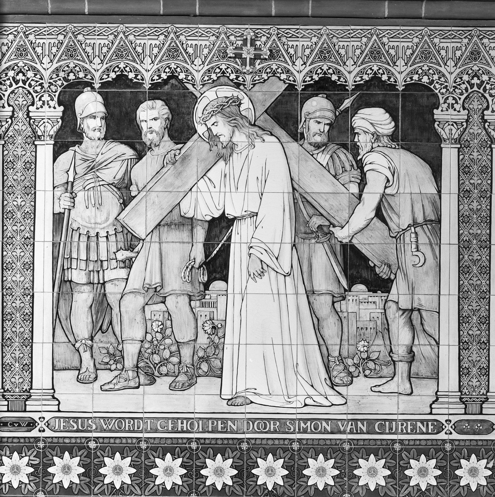 Interieur, tegeltableau met kruiswegstatie: Jezus wo...