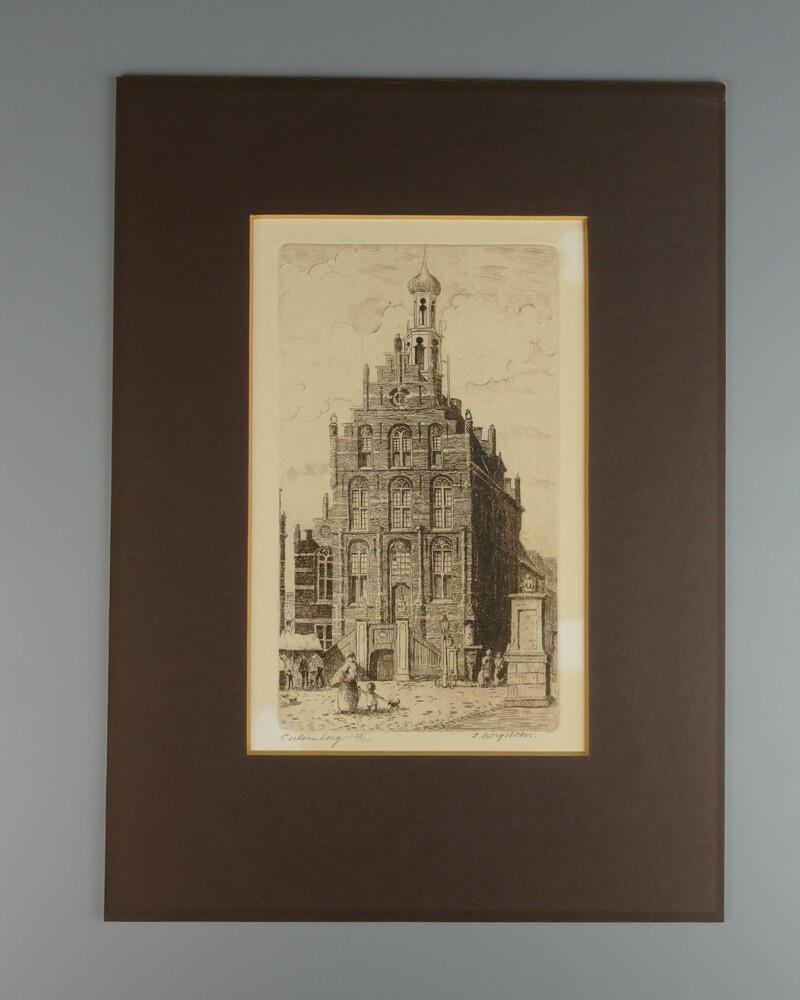 gravure voorstellende stadhuis op de Markt, gesignee...