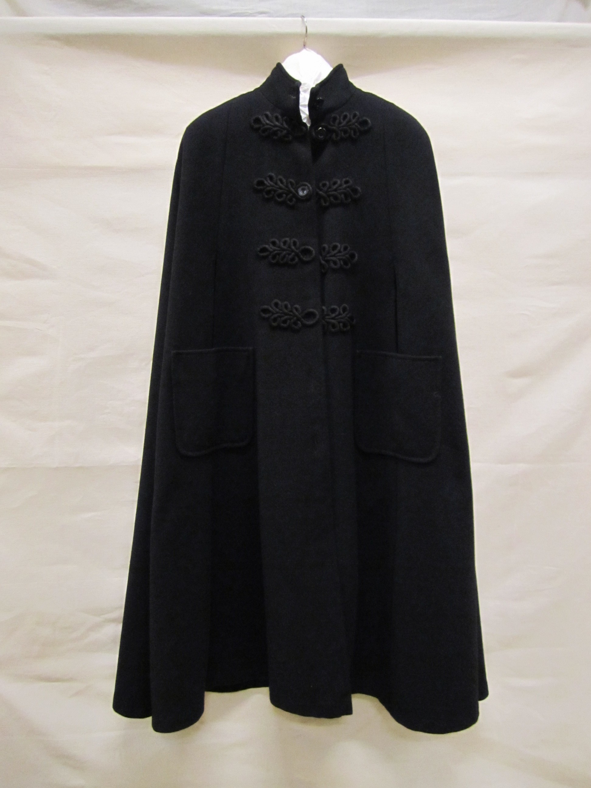 Cape van zwarte wol gevoerd met zwart gebloemd ribfl...